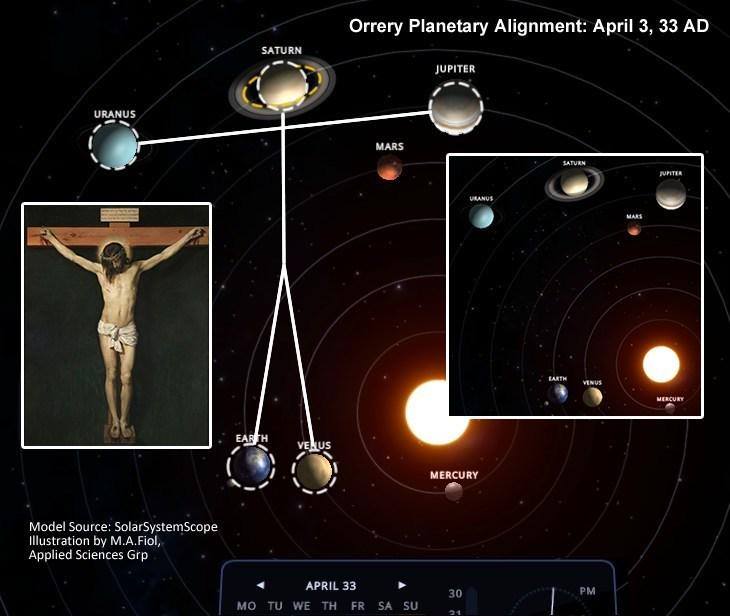 Un historiador ha observado que el 3 de abril del año 33 —fecha en que, según muchos investigadores, tuvo lugar la crucifixión de Cristo— los planetas Saturno, Urano, Júpiter, la Tierra y Venus se alinearon formando una figura similar a un hombre crucificado.